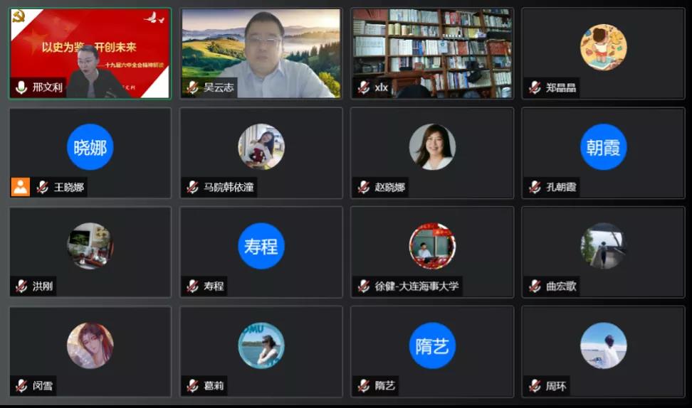 为深入学习贯彻党的十九届六中全会精神,11月17日上午9时,马克思主义学院党委组织召开“以史为鉴,开创未来——党的十九届六中全会精神解读”报告会。本次报告会邀请学院党委书记邢文利教授主讲,院长吴云志教授主持。报告会通过“腾讯会议”平台进行,学院全体教职工参会。