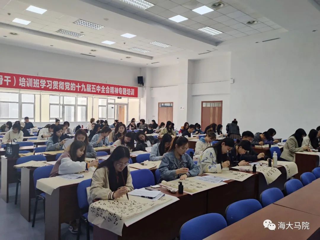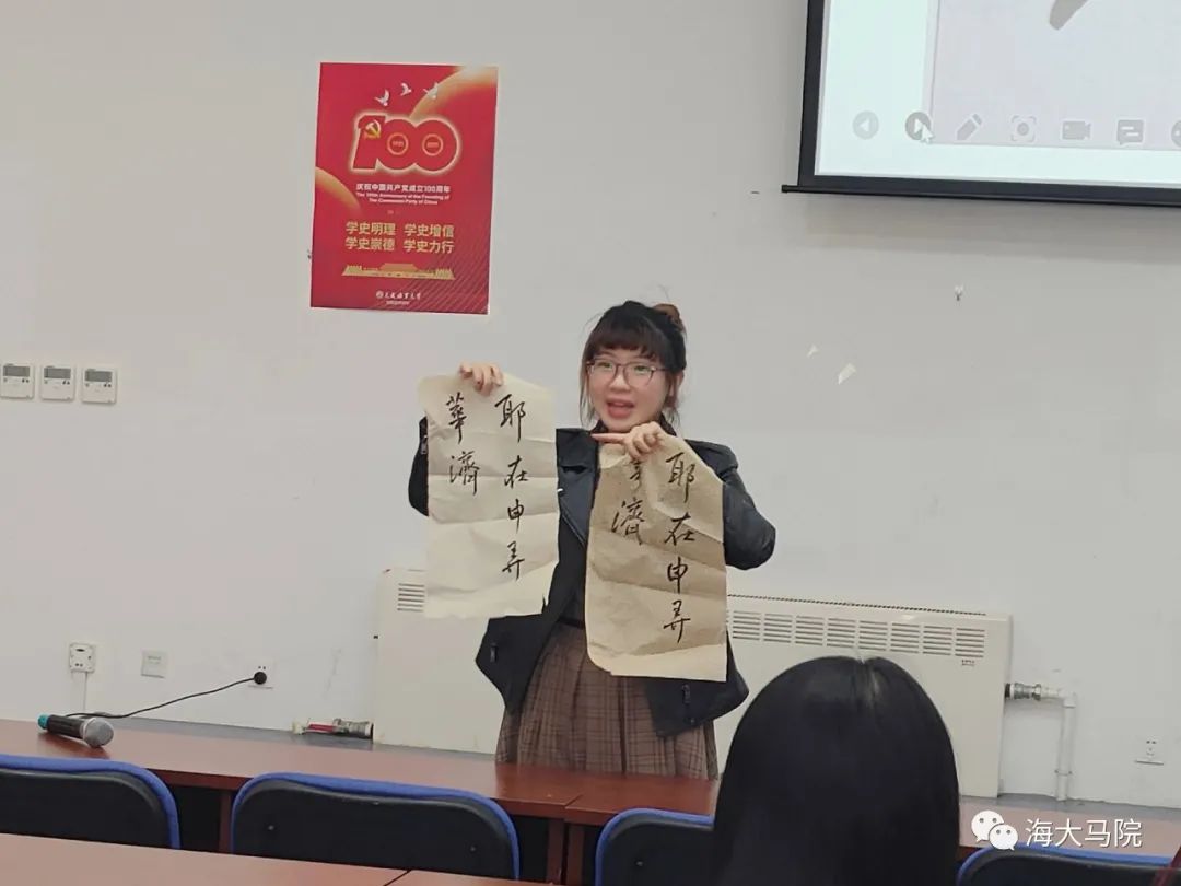为深入学习贯彻习近平总书记在党史学习教育动员大会上的重要讲话精神,切实做到“学史明理、学史增信、学史崇德、学史力行”,大连海事大学马克思主义学院组织了“书写百年党史,弘扬红色精神”主题书法课程。本次书法课程于2021年4月21日上午10点,在新大学生活动中心501教室正式开课。本门书法课程由辽宁师范大学美术学院研究生侯易菲担任指导教师。