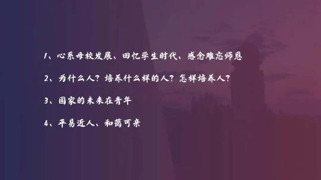 第三部分,他从“心系母校发展、回忆学生时代、感念难忘师恩”“为什么人?培养什么样的人?怎样培养人?”“国家的未来在青年”“平易近人、和蔼可亲”四个方面展开,感情真挚、深刻理性地分享了此次习近平总书记考察清华大学的切身收获和真切力量,倡议大家要实学实干,脚踏实地,追求卓越,行胜于言。