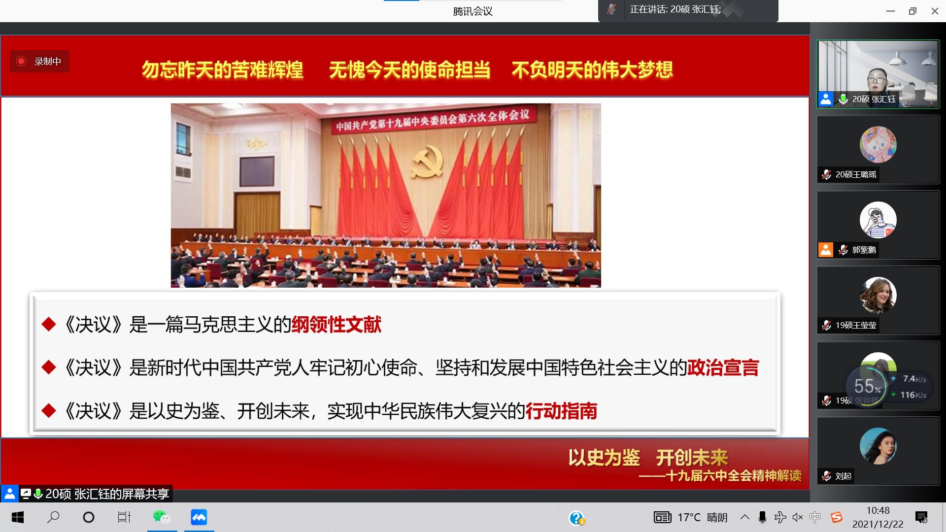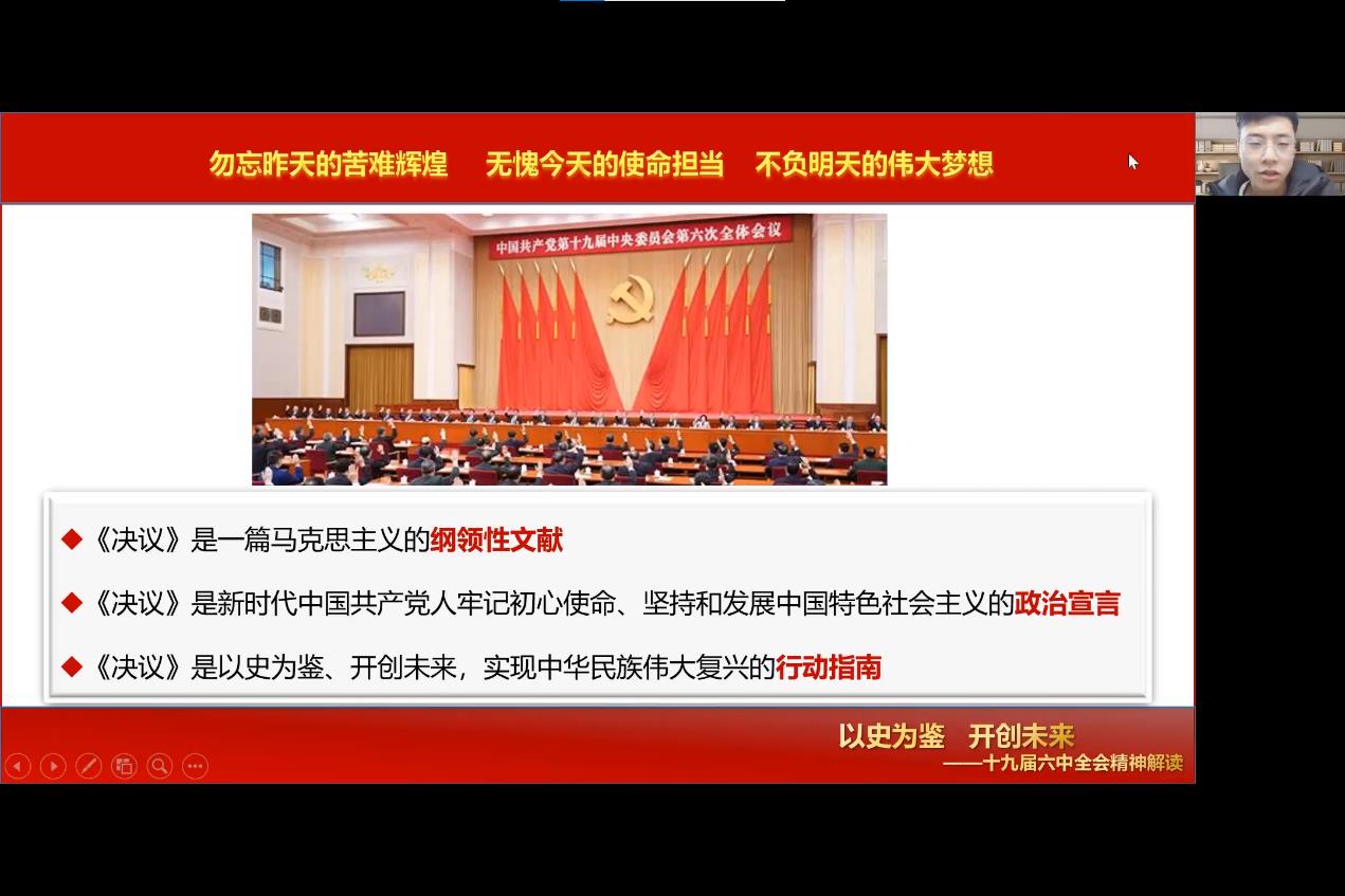 为深入学习贯彻党的十九届六中全会精神,锤炼对党绝对忠诚的政治品格。12月22日,“小海马”宣讲团为我院硕士生第二党支部开展“以史为鉴、开创未来——党的十九届六中全会精神解读”线上宣讲会。